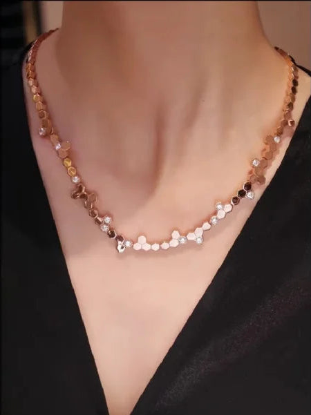 To preserve the beauty of your Golden Hive Choker, store it in a soft pouch or jewellery box when not in use. Keep it away from moisture, perfumes, and household chemicals, as these may affect the rose gold plating. Gently clean the piece with a soft, dry cloth after each wear to maintain its shine. Avoid wearing the choker while swimming, showering or exercising to ensure its lasting brilliance.