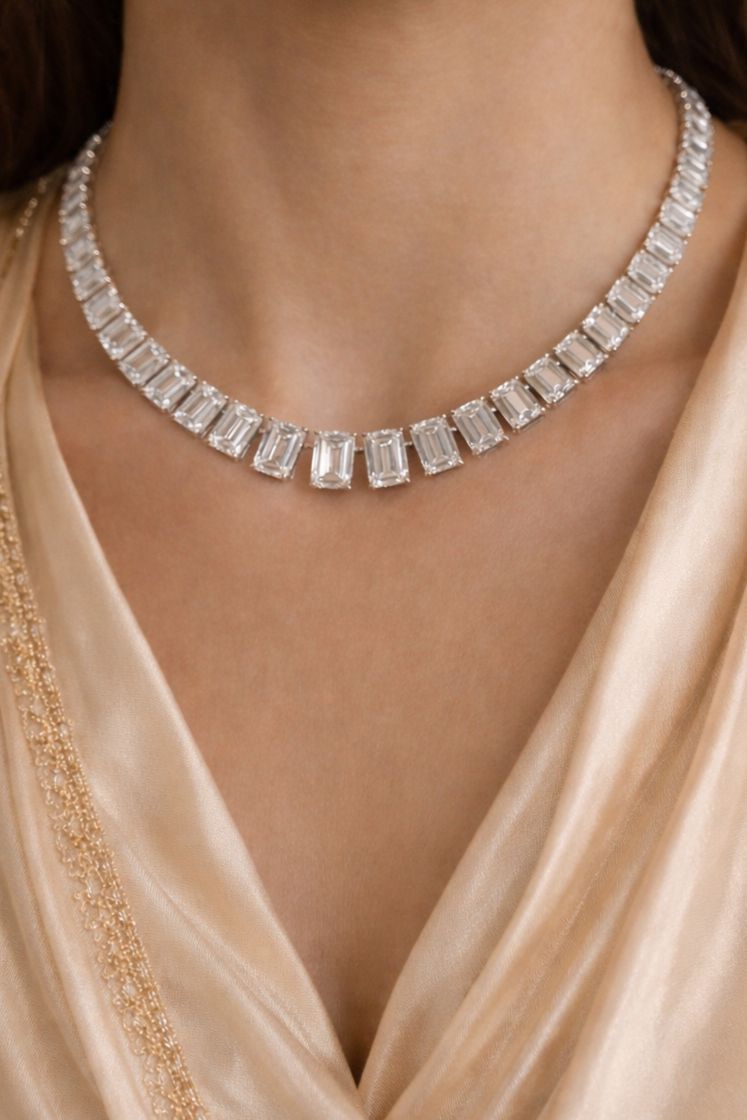 The Crescent Court Emerald Line Necklace is a statement of precision and presence. A seamless line of emerald-cut lab diamonds forms a structured collar of light, each stone perfectly aligned to create a clean, architectural silhouette along the neckline. The elongated cuts deliver sleek flashes of brilliance, giving the piece a powerful yet refined character.