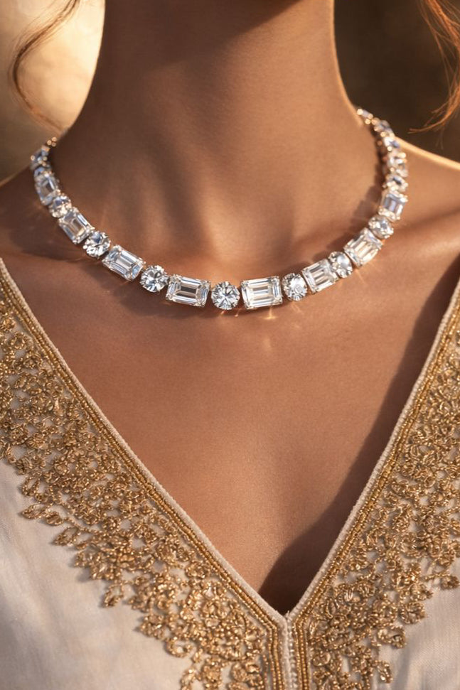 Inspired by the glow of intimate Eid gatherings, The Majlis Radiance Necklace captures the elegance of Arabian nights. A refined sequence of emerald-cut and brilliant round lab diamonds creates a graceful rhythm of light along the neckline, echoing lantern reflections and candlelit conversations.