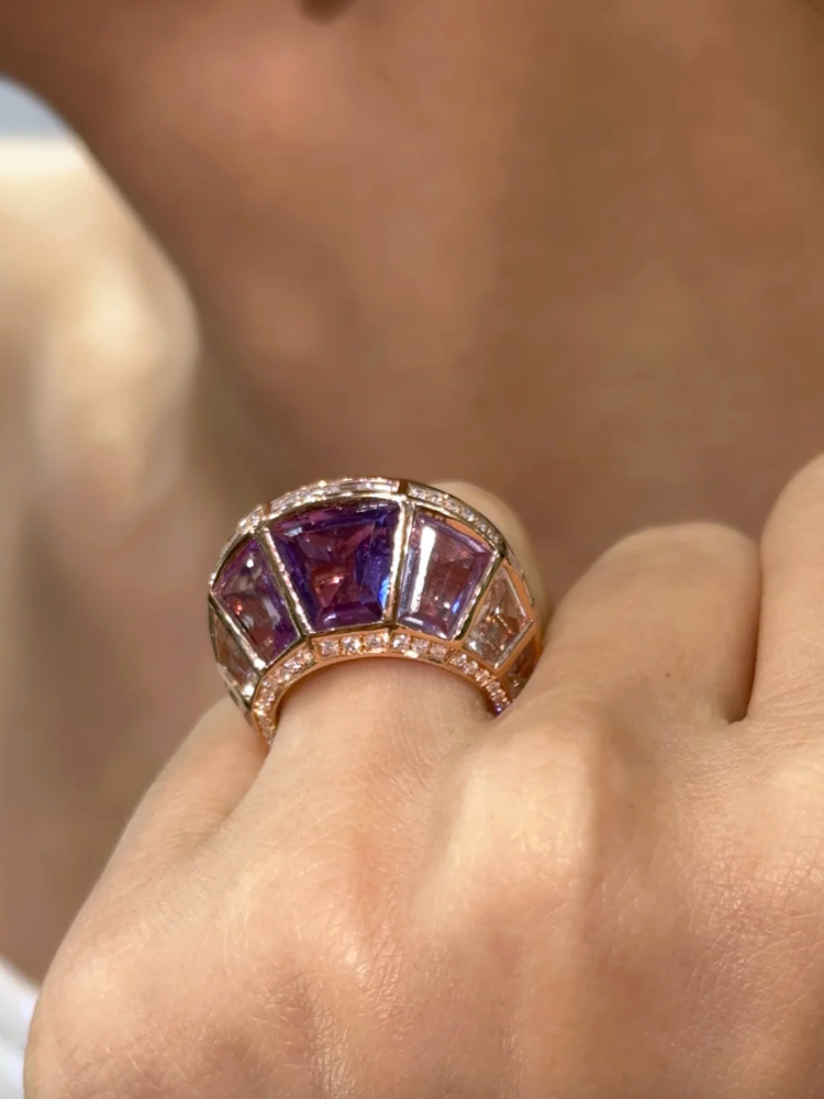 The earrings, crafted in 23.75 grams of gold, feature a graceful cascade of green, pink, and classic amethyst totalling 18.07 carats, accented with 1.15 carats of natural diamonds for a touch of brilliance. The coordinating ring, forged in 9.28 grams of gold, mirrors this composition with 13.28 carats of gemstones and 0.79 carats of diamonds, creating a seamless interplay of colour and form.