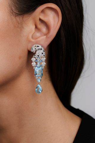 Paraiba Leopard Earrings in 925 sterling silver featuring white lab sapphires and vibrant synthetic Paraibas, designed with a wild-meets-refined aesthetic. Bold yet lightweight, perfect for destination nights and resort dinners."