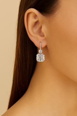 Asscher Dangler Earrings – 925 sterling silver with platinum plating, featuring 11.9 mm Asscher-cut lab-created sapphires for a dazzling red-carpet look