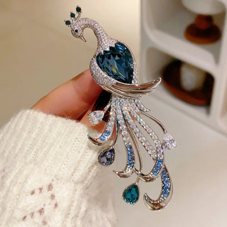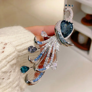 Noble Peacock Feather Brooch – copper-silver alloy with freshwater pearl and multicolored lab sapphires in green, blue, and purple.