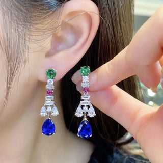 Elegant Aqua Mist Teardrop Earrings crafted in 925 sterling silver, featuring a pear-cut blue lab sapphire surrounded by soft accents of white, pink, and green lab sapphires. The earrings exude a serene, watery glow, perfect for adding effortless elegance to any look. Ideal for warm-weather occasions.