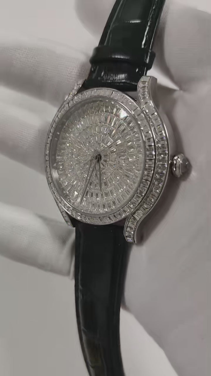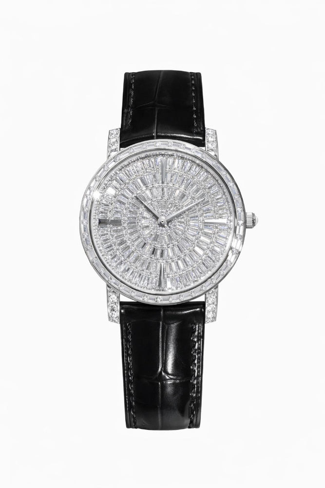 To preserve the brilliance of your Meridian Diamond Watch, avoid exposure to water, perfume, and harsh chemicals. When not in use, gently wipe with a soft, dry cloth and store in a cool, dry space to maintain its lasting elegance
