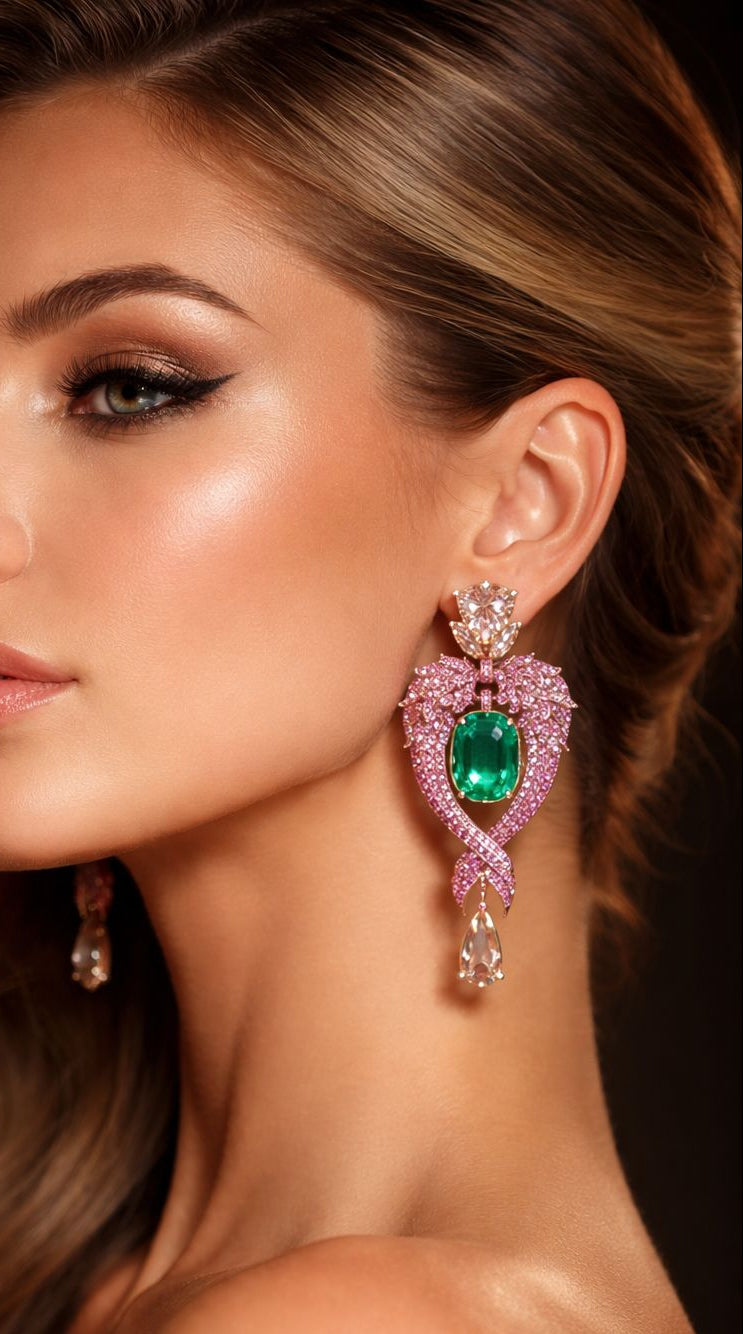 Elysian Phoenix is a celebration of rebirth, strength, and enduring beauty. Designed in a sculptural winged silhouette, these earrings unfold in sweeping curves that frame a vivid emerald-toned centre stone, suspended within a halo of brilliance and colour.