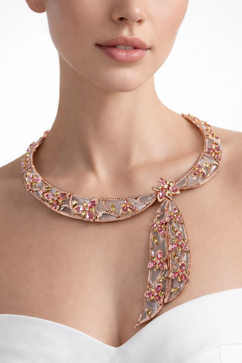 The design unfolds like a modern masterpiece. Mother-of-pearl meets the delicate hues of pink sapphire and peridot, creating a symphony of colour that feels regal and romantic. Set in gleaming gold and accentuated with hand-selected natural diamonds, the suite reflects exceptional craftsmanship and an exquisite balance of vibrancy and grace.