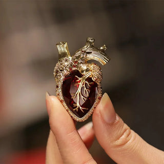 Maple leaf brooch made of copper and silver, set with green, blue, and red gemstones.