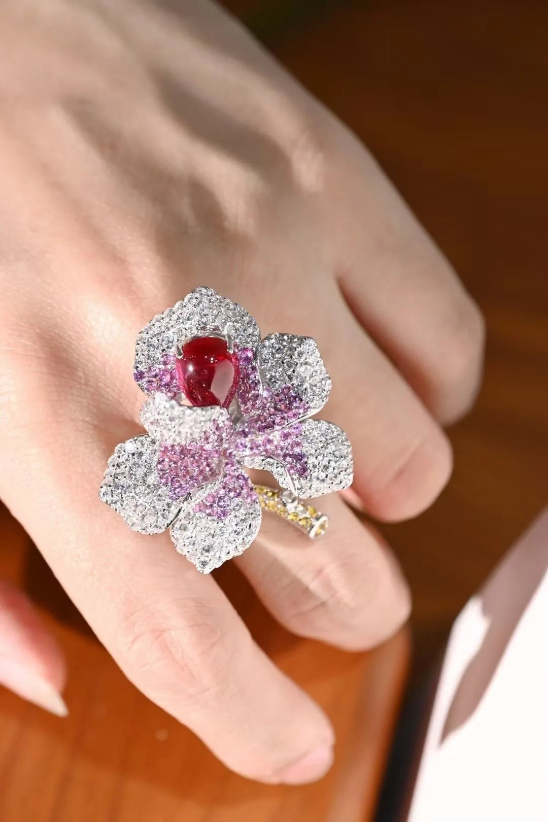 Every curve and contour of the design echoes the natural elegance of the orchid, with the lustrous silver frame enhancing the gemstone’s vibrant glow. The result is a masterpiece that feels both dramatic and sophisticated, ideal for those who wear their confidence as effortlessly as their style.