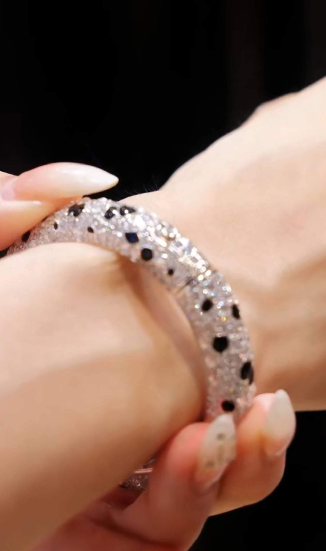 The Leopard Spots Bangle brings the beauty of untamed design into a sleek, wearable form. Crafted in 925 sterling silver and weighing 15 grams, this elegant piece is studded with lab-created sapphires, mimicking the organic patterns of leopard markings in a way that feels both bold and sophisticated.